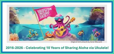 The Galveston Ukulele Society (GUS) was founded in 2016 to bring together players of all ages and abilities to share aloha and their love of the ukulele. We meet regularly and perform at many events on Galveston Island and the surrounding areas. Our octopus mascot GUS was designed by our friend Gene Mazzanti of the Plucking Strummers Ukulele Club of Los Angeles. Please like and follow us on Facebook! https://www.facebook.com/GalvestonUkuleleSociety?